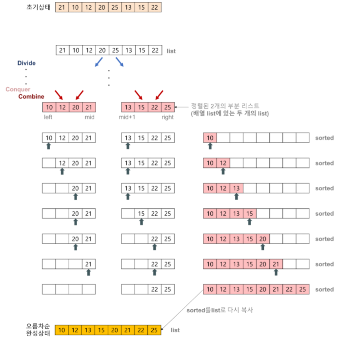 - 2개의 리스트의 값들을 처음부터 하나씩 비교하여 두 개의 리스트의 값 중에서 더 작은 값을 새로운 리스트(sorted)로 옮긴다.