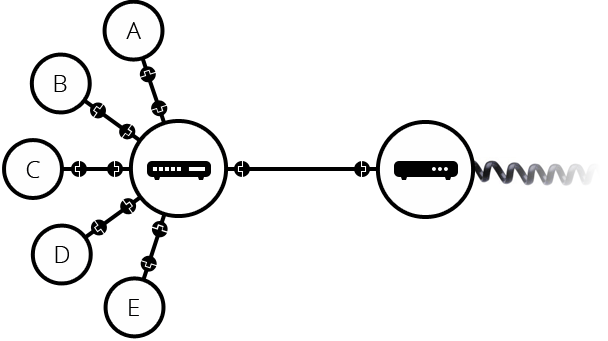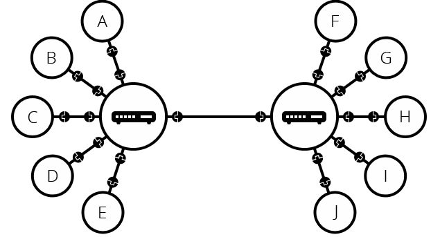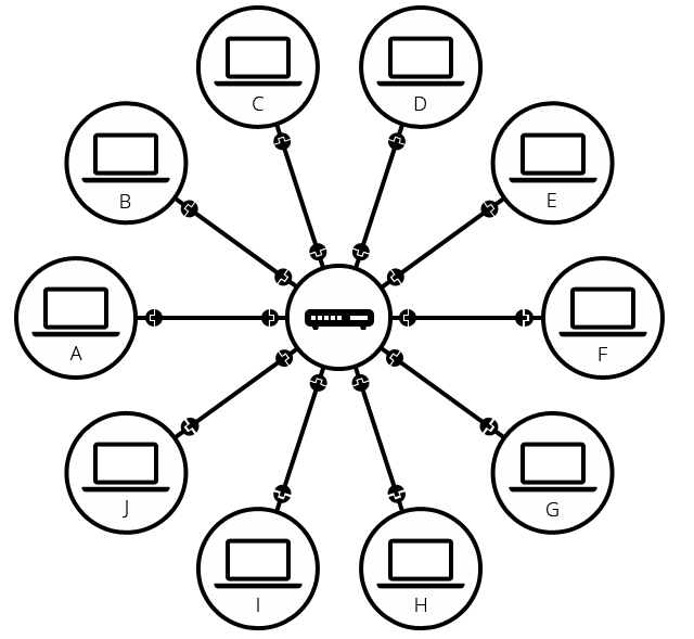 라우터를 사용하지 않던 전처럼 (10*9)/2 개의 케이블이 아닌 10개의 케이블만 필요하게된다.
