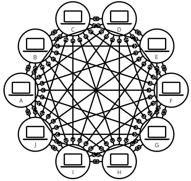 예를들어 10대의 컴퓨터를 연결하려면 각 컴퓨터끼리 연결한 (10*9)/2 개의 케이블이 필요할것이다.