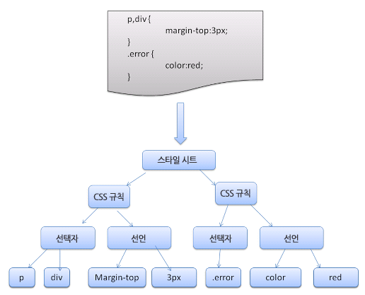 CSS파일은 스타일시트 객체로 파싱되고 각 객체는 CSS규칙을 포함한다.