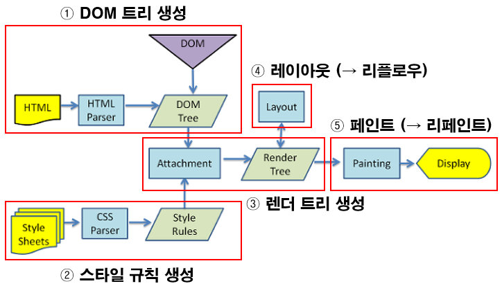 HTML파서는 <script>태그를 만나면 Javascript코드를 실행하기 위해 DOM생성프로세스를 중지하고 자바스크립트 엔진으로 권한을 넘기는데, 제어권한을 넘겨받은 Javascript엔진은 <script> 태그내의 Javascript코드또는 src속성에 정의된 Javascript파일을 로드하고 파싱하여 실행한다. Javascript의 실행이 완료되면 다시 HTML파서로 제어권한을 넘겨서 중지했던 시점으로 돌아가 DOM생성을 재개한다.