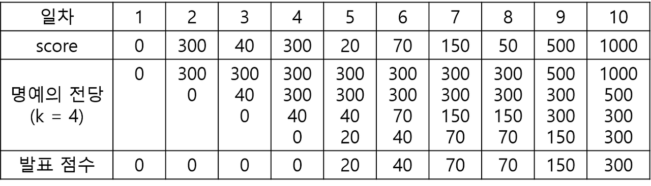 명예의 전당 목록의 점수의 개수 k, 1일부터 마지막 날까지 출연한 가수들의 점수인 score가 주어졌을 때,